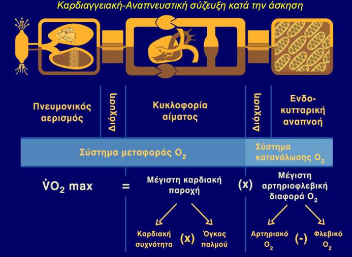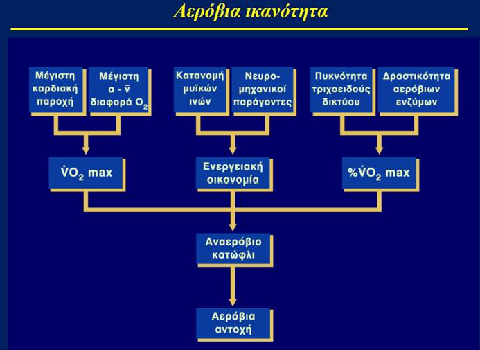 Η αερόβια ικανότητα είναι καθοριστική για την επίδοση ενός αθλητή και η αξιολόγησή της μία από τις βασικότερες εργομετρικές δοκιμασίες. Αναφέρεται στην ικανότητα του οργανισμού να εκμεταλλεύεται οξυγόνο για την παραγωγή ενέργειας. Επομένως, ο μέγιστος όγκος οξυγόνου (Ο2) που καταναλώνουν τα κύτταρα κατά τη μέγιστη προσπάθεια στη μονάδα του χρόνου ορίζεται ως μέγιστη πρόσληψη οξυγόνου (VΟ2max). Η μέγιστη πρόσληψη οξυγόνου μπορεί να θεωρηθεί δείκτης φυσικής κατάστασης του ατόμου. Υψηλές τιμές της VΟ2max σχετίζονται με την καλή φυσική κατάσταση αλλά και την καλή γενική υγεία. Η VΟ2max επηρεάζεται από την ηλικία, το φύλο, την προπονητική κατάσταση και το ποσοστό μυϊκής μάζας του εξεταζoμένου, την υπάρχουσα ασθένεια ή ακόμα και τη φαρμακευτική αγωγή που τυχόν ακολουθεί ο εξεταζόμενος. Η VΟ2max βελτιώνεται μέχρι την ηλικία των 20 ετών ενώ από εκεί και πέρα μειώνεται περίπου 10% ανά δεκαετία. Η πτώση της VΟ2max οφείλεται στη μείωση του όγκου παλμού, της μέγιστης καρδιακής συχνότητας, της αιματικής ροής προς τους εργαζόμενους σκελετικούς μύες και της λειτουργικότητας των σκελετικών μυών. Ο ρυθμός πτώσης της VΟ2max είναι παρόμοιος σε γυναίκες και άνδρες. Σε οποιαδήποτε ηλικία οι γυναίκες εμφανίζουν χαμηλότερα επίπεδα VΟ2max κατά 10%-20% συγκριτικά με τους άνδρες λόγω χαμηλότερων ποσοστών μυϊκής μάζας, μικρότερης συγκέντρωσης αιμοσφαιρίνης και όγκου παλμού συγκριτικά με τους άνδρες. Επίσης, οι αθλητές έχουν σημαντικά υψηλότερες τιμές VΟ2max σε σχέση με αγύμναστα άτομα ίδιας ηλικίας και φύλου. Ιδιαίτερα χαμηλές τιμές VΟ2max σχετίζονται με κακή υγεία και υποδεικνύουν πιθανό παθολογικό υπόβαθρο. Η μέγιστη δυνατή ποσότητα οξυγόνου (VO2max) που καταναλώνει ένα άτομο στη μονάδα του χρόνου, κατά την έντονη μυϊκή προσπάθεια ελάχιστης διάρκειας 3 λεπτών, αντανακλά την αναπνευστική, καρδιοαγγειακή και μυϊκή ικανότητα του οργανισμού να προσλαμβάνει, να μεταφέρει και να καταναλώνει αντίστοιχα τη μέγιστη δυνατή ποσότητα οξυγόνου στην μονάδα του χρόνου. Η VO2max εξαρτάται από την καρδιακή παροχή (CO – Cardiac Output), την ποσότητα δηλαδή του αίματος που στέλνει η καρδιά στην περιφέρεια και την αρτηριο-φλεβική διαφορά (A-V Ο2 diff), η οποία δείχνει τη δέσμευση του Ο2 από τους μυς. Η καρδιακή παροχή εξαρτάται από την καρδιακή συχνότητα (ΗR – Heart Rate) και από τον όγκο παλμού (SV – Stroke Volume), την ποσότητα αίματος δηλαδή, που στέλνει η καρδιά προς την περιφέρεια σε κάθε παλμό. Όλα αυτά αποτυπώνονται στην εξίσωση του Fick. VΟ2max= καρδιακή παροχή (καρδιακή συχνότητα * όγκο παλμού) * αρτηριοφλεβική διαφορά Ο2 (A-V O2) όπου: Καρδιακή παροχή (CO) = καρδιακή συχνότητα x όγκος παλμού Όγκος παλμού (SV) – ποσότητα αίματος που εξωθείται από την καρδιά κατά την φάση της συστολής (σε κάθε παλμό). Η διαφορά μεταξύ συστολικού και διαστολικού όγκου. Αρτηριοφλεβική διαφορά Ο2 – η διαφορά μεταξύ της περιεκτικότητας σε Ο2 του αρτηριακού αίματος και του μεικτού φλεβικού αίματος. Αυτή η εξίσωση αποτελεί χρήσιμη μέθοδο αξιολόγησης της κατάστασης του καρδιαγγειακού συστήματος του ατόμου.