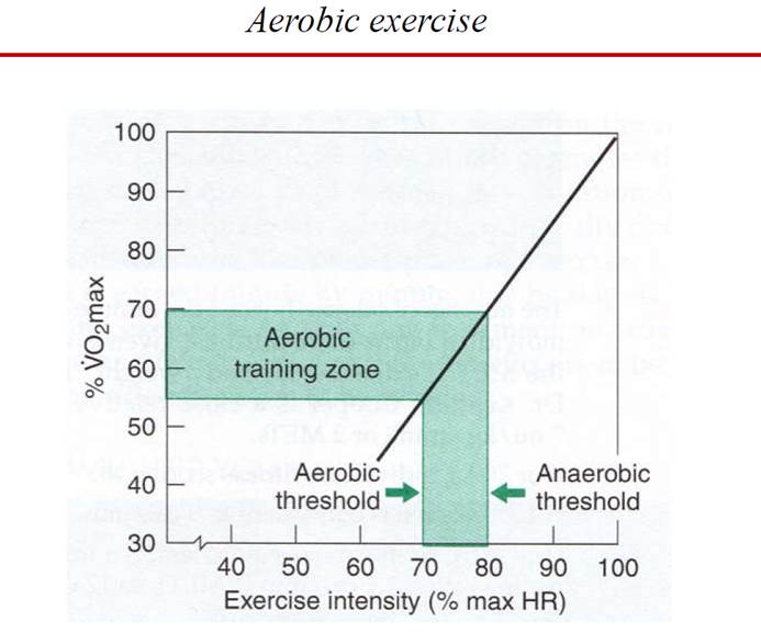 Κύρια πηγή ενέργειας ο αερόβιος μηχανισμός. Η αερόβια άσκηση αυξάνει την πρόσληψη οξυγόνου και τους κτύπους της καρδιάς, χρησιμοποιώντας μεγάλες ή/και πολλές μυϊκές ομάδες ή και συνδυασμό αυτών. Έχει μεγάλη διάρκεια -πάνω από 30’- και συχνότητα τουλάχιστον 3 φορές την εβδομάδα μέχρι και 5 φορές την εβδομάδα. Για αθλητές αντοχής οι προπονήσεις αυξάνονται ακόμα και πάνω από τις 5 φορές την εβδομάδα, με ρίσκο τραυματισμού όμως (Pollock et al. MSSE 1998). Η ένταση της αερόβιας άσκησης είναι πάνω από 55-65% της μέγιστης καρδιακής συχνότητας (Pollock et al. MSSE 1998), στο 70-90% της μέγιστης καρδιακής συχνότητας για βελτίωση της απόδοσης ή ακόμα και μεγαλύτερο σε προπονημένους. Γενικά, αθλήματα τα οποία χρησιμοποιούν πρωταρχικά τον αερόβιο μηχανισμό παραγωγής ενέργειας είναι αυτά όπου χρησιμοποιούν μεγάλες μυϊκές ομάδες του σώματος, για χρονική διάρκεια τουλάχιστον 15-20 λεπτά και αποσπούν καρδιακές συχνότητες μεγαλύτερες από 120 παλμούς / λεπτό. Αερόβιες δραστηριότητες θεωρούνται το περπάτημα, το τζόγκιγκ, το τρέξιμο μεγάλων αποστάσεων, η κολύμβηση, η ποδηλασία, ο χορός, η κωπηλασία, το σκι βουνού, κ.ά.