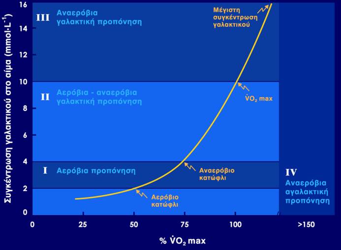 Αερόβιο κατώφλι – η ένταση της άσκησης με σταθερή συγκέντρωση γαλακτικού οξέος στο αίμα, υψηλότερη από αυτή της ηρεμίας. Ορίζεται στα 2,5 mmol/L. Αναερόβιο κατώφλι – η ένταση της άσκησης πάνω από την οποία, η συγκέντρωση του γαλακτικού οξέος στο αίμα ξεπερνά την ποσότητα απομάκρυνσής του, το σημείο δηλαδή κατά το οποίο η μεταβολική οξέωση, καθώς και οι σχετικές αλλαγές στην ανταλλαγή αερίων στους πνεύμονες, εμφανίζονται κατά τη διάρκεια της άσκησης. Ορίζεται στα 4 mmol/L. Το αναερόβιο κατώφλι δηλαδή, ορίζεται ως η ποσότητα Ο2 που καταναλώνει ο οργανισμός κατά την άσκηση, πριν αρχίσει η απότομη και συστηματική συγκέντρωση του γαλακτικού οξέος στο αίμα και αντιστοιχεί στην ένταση της προσπάθειας όπου ενεργοποιείται η αναερόβια γλυκόλυση. Σχετίζεται έντονα με την απόδοση σε αγωνίσματα αντοχής, γι’ αυτό και η προπόνηση των αθλητών σχεδιάζεται με βάση το αναερόβιο κατώφλι. Το αναερόβιο κατώφλι αντικατοπτρίζει τις μεταβολικές προσαρμογές των μυών και τις προσαρμογές των συστημάτων πρόσληψης και μεταφοράς Ο2. Ο προσδιορισμός του αναερόβιου κατωφλιού γίνεται με την μέτρηση και τον καθορισμό στο γαλακτικό κατώφλι ή/και στο αναπνευστικό κατώφλι ή/και στο κατώφλι καρδιακής συχνότητας (λιγότερο αξιόπιστος τρόπος). Γαλακτικό κατώφλι – όταν το αναερόβιο κατώφλι προσδιορίζεται με την μέτρηση του γαλακτικού οξέος στο αίμα τότε λέγεται γαλακτικό κατώφλι. Αναπνευστικό κατώφλι – προκύπτει από την ανάλυση των αερίων του εκπνεόμενου αέρα. Βρίσκεται στο σημείο εκείνο όπου η αύξηση πνευμονικού αερισμού (πρόσληψη όγκου αέρα από τους πνεύμονες ανά min) δεν συνοδεύεται από ανάλογη αύξηση στη VO2. Το αναπνευστικό κατώφλι αποτελεί αναίμακτη μέθοδο υπολογισμού του αναερόβιου κατωφλιού. Αναπνευστικό πηλίκο – πόσο CO2 παράγεται σε σχέση με το πόσο Ο2 καταναλώνεται. Respiratory quotient: RQ ή αναλογία ανταλλαγής αναπνευστικών αερίων (respiratory exchange ratio: RER). Το RQ αναφέρεται στην ανταλλαγή αερίων σε κυτταρικό επίπεδο ενώ το RER σε αναπνευστικό. Οι όροι χρησιμοποιούνται για να εκφράσουν το ίδιο πράγμα, δηλαδή το πηλίκο του παραγόμενου CO2 προς το καταναλισκόμενο O2 (RER = VCO2 produced/VO2 consumed). Η τιμή του RQ υποδεικνύει το είδος του υποστρώματος που οξειδώνεται ώστε να παραχθεί ενέργεια. Υψηλό αναερόβιο κατώφλι σημαίνει, καθυστέρηση της συσσώρευσης γαλακτικού οξέος. Δηλαδή ο αθλητής θα μπορέσει να συνεχίσει για μεγαλύτερο χρονικό διάστημα την προσπάθειά του, πριν εξαντληθεί. Συνήθως το αναερόβιο κατώφλι αντιστοιχεί στο 83% - 87% της μέγιστης καρδιακής συχνότητας και βέβαια είναι υψηλότερο στους καλύτερους αθλητές. Αναερόβια ικανότητα Η αναερόβια ικανότητα ορίζεται ως η ικανή εκτέλεση ενός σύντομου σε διάρκεια, αλλά μέγιστου σε ένταση έργου, κάτω από συνθήκες έλλειψης Ο2. Διακρίνεται στην: -Αναερόβια μυϊκή ισχύ, που εκφράζει την τιμή της μέγιστης δύναμης που εφαρμόζεται στη μονάδα του χρόνου (αναερόβια αγαλακτική φάση). Για τον προσδιορισμό της αξιολογείται η υψηλότερη τιμή στο συνολικό παραγόμενο έργο μιας μέγιστης προσπάθειας των 5-10 sec. -Αναερόβια μυϊκή αντοχή, που εκφράζει την τιμή της μέσης μέγιστης συνολικής δύναμης που εφαρμόζεται σε ένα σύντομο χρονικό διάστημα (αναερόβια γαλακτική φάση). Για τον προσδιορισμό της αξιολογείται η μέση τιμή στο συνολικό παραγόμενο έργο μιας μέγιστης προσπάθειας των 30-45sec και η συγκέντρωση γαλακτικού στο αίμα μετά το τέλος της προσπάθειας. Επίσης προσδι