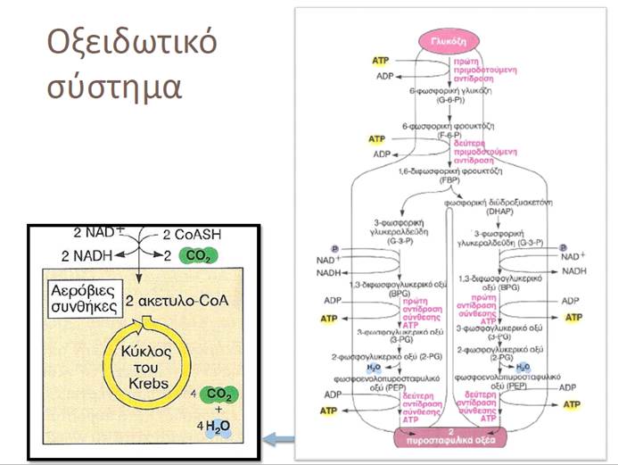 Τα κύτταρα χρησιμοποιούν τρεις κύριες μεταβολικές οδούς για να μεταφέρουν στο μόριο του ΑΤΡ την ενέργεια που παράγεται από την διάσπαση των καύσιμων υλικών. Οι τρεις αυτές οδοί είναι η γλυκόλυση, ο κύκλος του κιτρικού οξέος και η οξειδωτική φωσφορυλίωση. Η γλυκόλυση είναι η οδός στην οποία καταβολίζονται οι υδατάνθρακες και κυρίως η γλυκόζη. Αποτελείται από δέκα ενζυμικές αντιδράσεις, οι οποίες μετατρέπουν ένα μόριο γλυκόζης σε δύο μόρια πυροσταφυλικού ανιόντος. Από τις αντιδράσεις αυτές παράγονται δύο μόρια ΑΤΡ, δύο υδρογονοκατιόντα και δύο NADH. Κατά την πορεία της γλυκόλυσης δεν απαιτείται οξυγόνο και οι αντιδράσεις επιτελούνται στο κυτοσόλιο (το εσωτερικό μέρος του κυττάρου, χωρίς τα κυτταρικά οργανίδια). Το τελικό προϊόν της γλυκόλυσης είναι το πυροσταφυλικό ανιόν, το οποίο μπορεί σε αναερόβιες συνθήκες να μετατραπεί σε γαλακτικό, ενώ κάτω από αερόβιες συνθήκες εισέρχεται στον κύκλο του κιτρικού οξέος. Ο κύκλος του κιτρικού οξέος είναι μία σειρά από αντιδράσεις, που ολοκληρώνεται σε οκτώ στάδια, και οδηγεί σε μετατροπή μιας ακετυλο-ομάδας σε δύο μόρια διοξειδίου του άνθρακα και σε ανηγμένα συνένζυμα. Ο κύκλος του Krebs λειτουργεί μόνο κάτω από αερόβιες συνθήκες, διότι τα NADΗ και FADΗ2 οξειδώνονται στο μιτοχόνδριο μόνο με την μεταφορά ηλεκτρονίων στο μοριακό οξυγόνο.