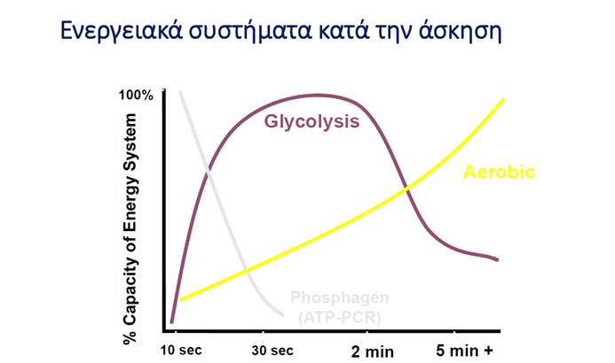 · Σύστημα ATP-CP (άμεσο ενεργειακό) · Σύστημα αναερόβιας γλυκόλυσης (βραχυπρόθεσμο ενεργειακό) · Αερόβιο σύστημα (μακροπρόθεσμο ενεργειακό) -Το φωσφορικό σύστημα ATP-CP (αναερόβιος αγαλακτικός μεταβολισμός) παρέχει στιγμιαία ενέργεια από τα έτοιμα αποθέματα ενέργειας που βρίσκονται αποθηκευμένα στα μυϊκά κύτταρα. Είναι μια γρήγορη διαδικασία σύνθεσης ΑΤΡ από φωσφοκρεατίνη PC (creatine phosphate - μόριο φωσφορικού άλατος υψηλής ενέργειας) και ADP που δεν απαιτεί οξυγόνο. Η κύρια λειτουργία του είναι η διατήρηση των επιπέδων του ΑΤΡ κατά τα πρώτα δευτερόλεπτα έντονης μυϊκής δραστηριότητας και μπορεί να καλύψει τις ενεργειακές ανάγκες των μυών για περίπου 3-10 δευτερόλεπτα αφού τα αποθέματα ATP και CP είναι περιορισμένα. Σε αυτήν την φάση δεν παράγεται γαλακτικό οξύ. -Το σύστημα αναερόβιας γλυκόλυσης (γλυκολυτικό σύστημα ή αναερόβιος γαλακτικός μεταβολισμός) παρέχει λιγοστή ποσότητα ενέργειας προερχόμενη από ημιτελή καύση της γλυκόζης εν τη απουσία του οξυγόνου ενώ ταυτόχρονα παράγεται γαλακτικό οξύ. Το γαλακτικό δρα και σαν «ρεζερβουάρ» ενέργειας όταν και όποτε ζητηθεί. Εδώ λαμβάνει χώρα η απελευθέρωση ενέργειας μέσω διάσπασης της γλυκόζης και σχηματισμού πυροσταφυλικού και γαλακτικού οξέος (ο κύκλος Cori συνδέει τη γλυκονεογένεση με την αναερόβια γλυκόλυση – θα αναλυθεί παρακάτω). Καθοριστικός παράγοντας είναι η συγκέντρωση ΑΤΡ στους μυς. Απαιτούνται ειδικά γλυκολυτικά ένζυμα, όπως η φωσφοφρουκτοκινάση, η οποία αποτελεί το βασικό ένζυμο που καθορίζει το ρυθμό της αναερόβιας γλυκόλυσης. -Το αερόβιο ή οξειδωτικό σύστημα είναι το τελικό σύστημα παραγωγής ενέργειας στο κύτταρο και το πιο σύνθετο και χρησιμοποιεί ως πηγές ενέργειας υδατάνθρακες (γλυκόζη-γλυκογόνο), λίπη (λιπαρά οξέα κυρίως και ελάχιστα γλυκερόλη) και πρωτεΐνες (αμινοξέα). Με την διαδικασία αυτή το σώμα αποσυνθέτει καύσιμα με τη βοήθεια οξυγόνου για να παράγει ενέργεια και έχει τεράστια τέτοια ικανότητα παραγωγής ενέργειας. Η διαδικασία αυτή, που ονομάζεται και κυτταρική αναπνοή (ή κυτταρική αερόβια αναπνοή) περιλαμβάνει τρεις διαδικασίες-φάσεις: i) Την αερόβια γλυκόλυση, όπου παρουσία οξυγόνου το πυροσταφυλικό μετατρέπεται σε ακετυλο-συνένζυμο Α. ii) Τον κύκλο του KREBS, μια σειρά χημικών αντιδράσεων που επιτρέπουν την πλήρη οξείδωση του ακετυλο-συνενζύμου Α σε υδρογόνο και διοξείδιο του άνθρακα. iii) Την αναπνευστική αλυσίδα ή οξειδωτική αλυσίδα μεταφοράς ηλεκτρονίων ή οξειδωτική φωσφορυλίωση, όπου τα άτομα υδρογόνου χωρίζονται, παρουσία ενζύμων, σε πρωτόνια και ηλεκτρόνια. Τα πρωτόνια ενώνονται με το οξυγόνο και σχηματίζουν νερό και τα ηλεκτρόνια μέσα από μια σειρά αντιδράσεων σχηματίζουν ΑΤΡ.
