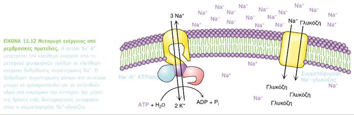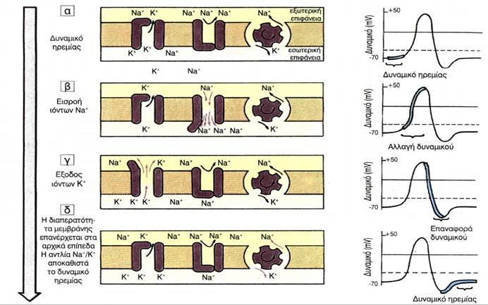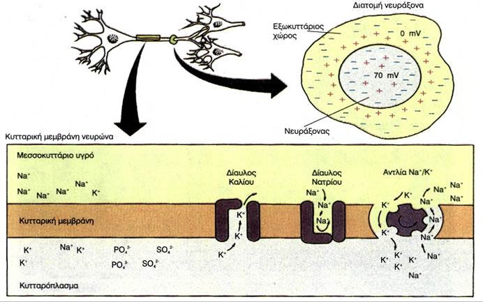 Πηγή: Jeremy M. Berg, John L. Tymoczko, Lubert Stryer. Biochemistry, 5th edition, W.H. Freeman and Co., 2002, New York. Πανεπιστημιακές Εκδόσεις Κρήτης, Ηράκλειο, 2012. Μετάφραση: Α. Αλετράς, Θ. Βαλκανά, Δ. Δραΐνας, Κ. Δραΐνας, Η. Κούβελας, Γ.Κ. Παπαδόπουλος, και Μ. Φράγκου-Λαζαρίδη. Άρα, η διαρκής λειτουργία της αντλίας νατρίου-καλίου και η συνεπαγόμενη ανισοκατανομή αυτών των ιόντων, επιτρέπει στο κύτταρο να την χρησιμοποιήσει ώστε να συσσωρεύσει χρήσιμες ουσίες όπως τα σάκχαρα, κάτι που δεν θα μπορούσε να γίνει διαφορετικά. Δεν είναι τυχαίο λοιπόν, που η αντλία νατρίου-καλίου καταναλώνει το 25 % των κυτταρικών ενεργειακών αποθεμάτων! Για πολλούς και διάφορους λόγους πολλές ουσίες και ιόντα έχουν ανισοκατανομή μεταξύ του εσωτερικού και του εξωτερικού των κυττάρων (πολλές φορές με διαφορά συγκεντρώσεων που να είναι 1000 έως 10.000 φορές μεγαλύτερη η μια από την άλλη). Η ανισοκατανομή αυτή έχει μεγάλη σημασία για τη διατήρηση του όγκου του κυττάρου και γενικότερα της ομοιοστασίας (δηλ. των σταθερών συνθηκών στο εσωτερικό ενός οργανισμού). Μπορεί δε η ανισοκατανομή αυτή να χρησιμοποιηθεί προς ίδιον όφελος. Το ότι, π.χ., υπάρχει διαρκώς 10-12x μεγαλύτερη συγκέντρωση ιόντων νατρίου, Na+, στο εξωτερικό του κυττάρου σε σύγκριση με τη συγκέντρωση στο εσωτερικό του, σημαίνει ότι αυθόρμητα τα Na+ θα εισέρχονται στο κύτταρο μέσω των αντίστοιχων διαύλων Na+. Αυτό μπορεί να το εκμεταλλευτεί το κύτταρο, με έναν άλλο μηχανισμό που λέγεται μηχανισμός συμμεταφοράς. Δηλαδή υπάρχει σε πολλά κύτταρα μεταφορέας που μεταφέρει και ιόντα νατρίου και κάποια θρεπτική ουσία (π.χ. σάκχαρο, και άλλος μεταφορέας για μεταφορά ιόντων νατρίου και αμινοξέων) με τρόπο ώστε τα μεν ιόντα νατρίου να μεταφέρονται από περιοχή υψηλής σε περιοχή χαμηλής συγκέντρωσης (δηλαδή αυθόρμητα), και έτσι να συμπαρασύρουν και τα σάκχαρα που μεταφέρονται από περιοχή χαμηλής συγκέντρωσης σε περιοχή υψηλής συγκέντρωσης (αν μεταφέρονταν μόνα τους θα απαιτείτο ενέργεια). Μάλιστα, σε τέτοιο σύστημα συμμεταφοράς, είναι αδύνατη η μεταφορά ιόντων νατρίου και μόνον, και σαφώς δεν είναι δυνατή η μεταφορά μορίων σακχάρου ή αμινοξέων. Το τελευταίο χρειάζεται ενέργεια, και πραγματοποιείται μόνον με τη σύζευξή του με μια διεργασία που γίνεται αυθόρμητα (τη μετάβαση ιόντων νατρίου από περιοχή υψηλής συγκέντρωσης σε περιοχή χαμηλής συγκέντρωσης). Ένα απλό δούναι-λαβείν, στη καθομιλουμένη πάρε-δώσε.] Η μεγάλη συγκέντρωση θετικών ιόντων στην εξωτερική επιφάνεια της μεμβράνης και αρνητικών ιόντων στην εσωτερική δημιουργούν διαφορά δυναμικού. Το δυναμικό αυτό ονομάζεται δυναμικό ηρεμίας και είναι περίπου -70 mV (επειδή η εσωτερική επιφάνεια της μεμβράνης είναι ηλεκτραρνητικά φορτισμένη σε σχέση με την εξωτερική) [mV = millivolt, ισοδυναμεί με 10-3 Volt]. Η μεμβράνη του νευρώνα διατηρεί το δυναμικό ηρεμίας για όσο διάστημα δε δέχεται κάποιο ερέθισμα ή, όταν δέχεται ερεθίσματα, με ένταση μικρότερη από κάποια οριακή τιμή.