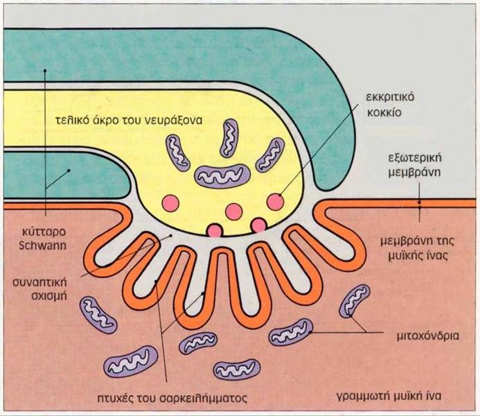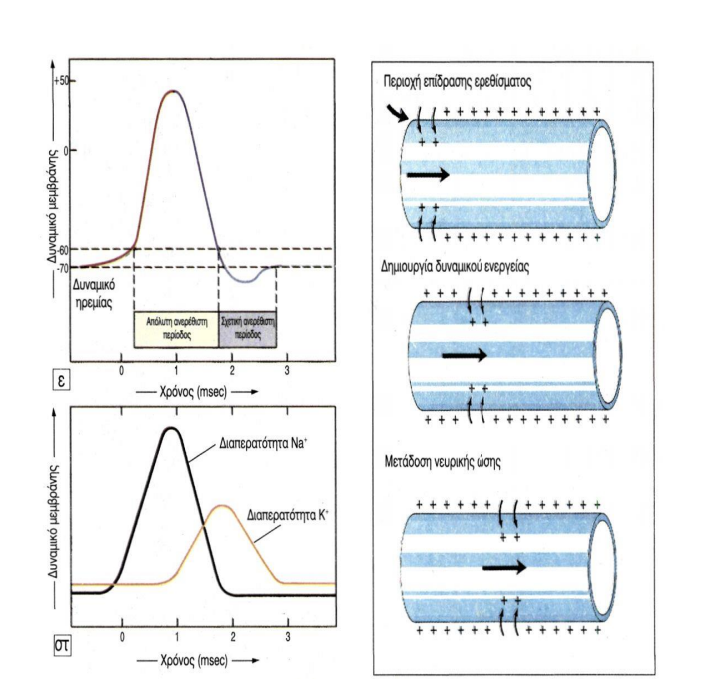 εικ.3 ε. Μεταβολές στο δυναμικό εικ.4. Νευρική ώση στ. Μεταβολές στη διαπερατότητα των Να+, Κ+ Τα ερεθίσματα τα οποία μπορούν να προκαλέσουν δημιουργία νευρικής ώσης είναι χημικά, ηλεκτρικά, μηχανικά, θερμικά κ.ά. Ερεθίσματα με ένταση μικρότερη από μια οριακή τιμή δεν προκαλούν νευρική ώση. Ο νευρώνας μπορεί να απαντήσει σε ένα νέο ερέθισμα μόνο μετά την παρέλευση 0,5-2 msec από τη δημιουργία νευρικής ώσης. Το διάστημα αυτό ονομάζεται απόλυτη ανερέθιστη περίοδος. Συνάψεις Οι νευρώνες συνδέονται με άλλους νευρώνες (ή εκτελεστικά όργανα) με τη βοήθεια συνάψεων. Σύναψη είναι η περιοχή λειτουργικής σύνδεσης των τελικών κομβίων του νευράξονα ενός νευρώνα με άλλα νευρικά κύτταρα ή με ειδικά διαμορφωμένες θέσεις των εκτελεστικών οργάνων (μυών ή αδένων) (εικ.5α).
