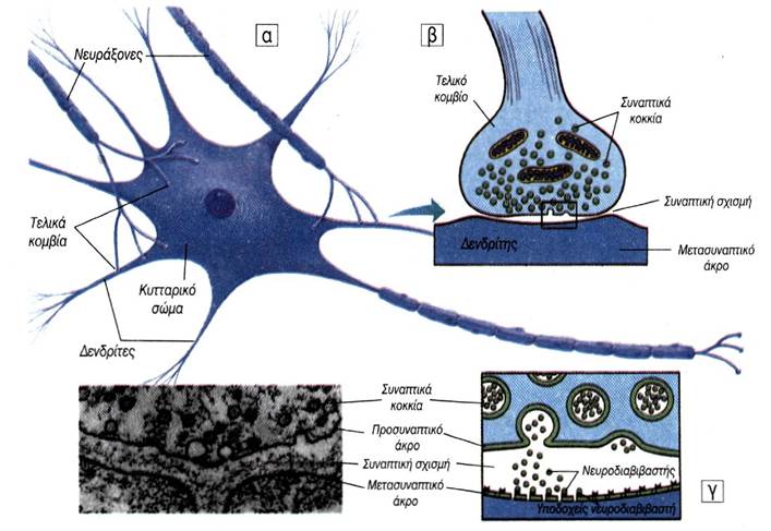 εικ.5α. Σύναψη β. Τελικό κόμβιο και μετασυναπτικό άκρο γ. Απελευθέρωση νευροδιαβιβαστή Νόσος Parkinson: Μία ασθένεια που σχετίζεται με τη μείωση παραγωγής νευροδιαβιβαστών Το 1871 ο James Parkinson περιέγραψε τα συμπτώματα μιας ασθένειας, που σήμερα φέρει το όνομά του. Τα χαρακτηριστικά συμπτώματα της ασθένειας αυτής κάνουν την εμφάνισή τους στην 5η ή 6η δεκαετία της ζωής του ατόμου και είναι το ρυθμικό τρέμουλο των μυών, η δυσκολία στο ξεκίνημα εκτέλεσης μιας εκούσιας κίνησης και η βραδύτητα στην εκτέλεση κινήσεων. Στον εγκέφαλο των ατόμων που πάσχουν από Parkison βρέθηκαν μειωμένα ποσά των νευροδιαβιβαστών νοραδρεναλίνης, σεροτονίνης και ιδιαίτερα της ντοπαμίνης. Τα συμπτώματα της ασθένειας συχνά ελαττώνονται με ενδοφλέβια χορήγηση της ουσίας L-3, 4, υδροξυφαινυλαλανίνη (L-DOPA). Το αμινοξύ αυτό είναι πρόδρομη ένωση της ντοπαμίνης και οι θεραπευτικές ιδιότητές του αποδίδονται στη μετατροπή του στον εγκέφαλο των ασθενών σε ντοπαμίνη. Περίληψη Το νευρικό σύστημα αποτελείται από τον εγκέφαλο, το νωτιαίο μυελό και τα νεύρα. Όλα αυτά τα τμήματα του νευρικού συστήματος συνίστανται κυρίως από τα κύτταρα του νευρικού ιστού (νευρώνες και νευρογλοιακά κύτταρα). Οι νευρώνες είναι ειδικά διαφοροποιημένα κύτταρα και αποτελούνται από το κυτταρικό σώμα και από τις αποφυάδες του: τους δενδρίτες και το νευρίτη. Τα νευρογλοιακά κύτταρα είναι βοηθητικά κύτταρα. Στη μεμβράνη του νευρώνα, όταν δεν δέχεται ερεθίσματα, υπάρχει διαφορά δυναμικού (-70mV), που ονομάζεται δυναμικό ηρεμίας. Όταν η μεμβράνη δεχτεί ερέθισμα με ένταση μεγαλύτερη από μία οριακή τιμή, τότε, λόγω αλλαγών στη διαπερατότητα της μεμβράνης ως προς τα Κ+ και Na+, δημιουργούνται αλλαγές στο δυναμικό οι οποίες μεταφέρονται κατά μήκος του νευράξονα (νευρική ώση). Οι νευρικές ώσεις μεταδίδονται από νευρώνα σε νευρώνα ή από νευρώνα σε εκτελεστικά όργανα δια μέσου των συνάψεων και με τη βοήθεια των νευροδιαβιβαστών.