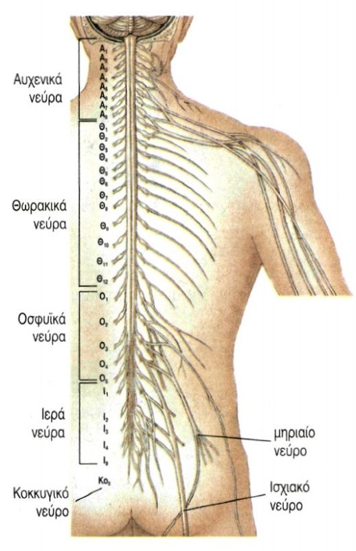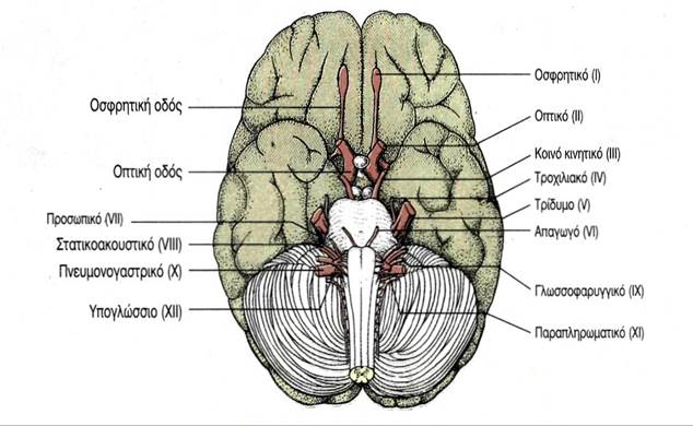 εικ.6 Εγκεφαλικά νεύρα Από το νωτιαίο μυελό εκφύονται 31 ζεύγη νωτιαίων νεύρων (εικ.7). Όλα τα νωτιαία νεύρα είναι μεικτά, σχηματίζονται από αποφυάδες αισθητικών και κινητικών νευρώνων και νευρώνουν τον αυχένα, τον κορμό και τα άκρα.