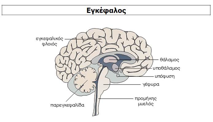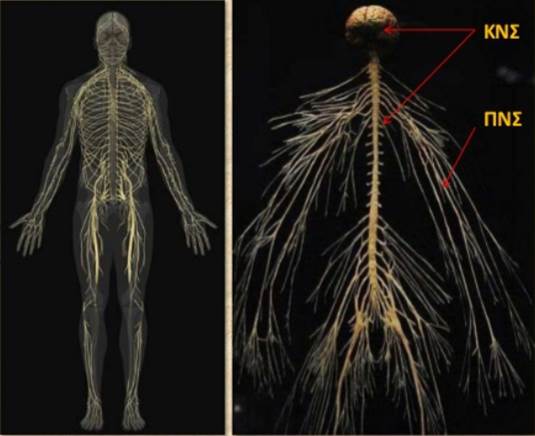 Το Κεντρικό Νευρικό Σύστημα συντονίζει όλες τις λειτουργίες του οργανισμού. Αποτελείται από τον εγκέφαλο και από το νωτιαίο μυελό (εικ.10α). Τα όργανα αυτά προστατεύονται μέσα στην κρανιακή κοιλότητα και το σπονδυλικό σωλήνα, αντίστοιχα. Επιπρόσθετα, τόσο ο εγκέφαλος όσο και ο νωτιαίος μυελός περιβάλλονται από τρεις προστατευτικές μεμβράνες, τις μήνιγγες. Ανάμεσα στις δύο εσωτερικές μήνιγγες (υπαραχνοειδής χώρος) κυκλοφορεί το εγκεφαλονωτιαίο υγρό, το οποίο μειώνει τους κραδασμούς και συμβάλλει στη στήριξη και θρέψη του εγκεφάλου και του νωτιαίου μυελού. Το εγκεφαλονωτιαίο υγρό κυκλοφορεί, επίσης, στον κεντρικό νευρικό σωλήνα του νωτιαίου μυελού και στις κοιλίες του εγκεφάλου. Αυτές είναι τέσσερις κοιλότητες στο εσωτερικό του εγκεφάλου, στις οποίες παράγεται το εγκεφαλονωτιαίο υγρό και επικοινωνούν με τον κεντρικό νευρικό σωλήνα του νωτιαίου μυελού.