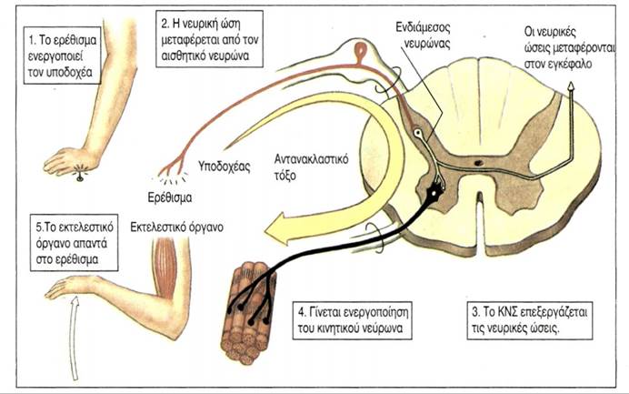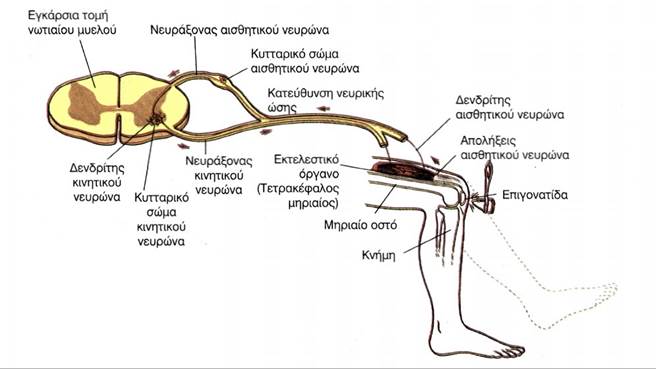 Τα αντανακλαστικά είναι αυτόματες, ακούσιες απαντήσεις, τις οποίες δίνει ο οργανισμός σε αλλαγές που πραγματοποιούνται μέσα ή έξω από το σώμα. Μέσω των αντανακλαστικών ελέγχονται απαντήσεις που πρέπει να εκδηλωθούν με ταχύτητα όπως οι αντιδράσεις σε κατάσταση έκτακτης ανάγκης και η αυτόματη διατήρηση της ισορροπίας. Τα αντανακλαστικά βοηθούν στη διατήρηση της ομοιόστασης του οργανισμού όπως, για παράδειγμα, στη ρύθμιση του καρδιακού και του αναπνευστικού ρυθμού, της πίεσης του αίματος κ.ά. Σε ορισμένα αντανακλαστικά, όπως είναι το άνοιγμα και κλείσιμο των βλεφάρων του οφθαλμού, συμμετέχει ο εγκέφαλος, ενώ σε άλλα, όπως η απομάκρυνση του χεριού από θερμό ή αιχμηρό αντικείμενο δε συμμετέχει. Στο αντανακλαστικό του γόνατου συμμετέχουν δύο μόνο νευρώνες: ένας αισθητικός και ένας κινητικός. Οι απολήξεις του αισθητικού νευρώνα βρίσκονται στον τετρακέφαλο μηριαίο μυ και διεγείρονται ύστερα από κτύπημα στο σύνδεσμο της επιγονατίδας. Οι νευρικές ώσεις που δημιουργούνται φτάνουν στο νωτιαίο μυελό, όπου ο αισθητικός νευρώνας σχηματίζει σύναψη με τους δενδρίτες του κινητικού νευρώνα. Δια μέσου του κινητικού νευρώνα επιστρέφουν στο μυ, ο οποίος συσπάται με αποτέλεσμα την έκταση της κνήμης. Το αντανακλαστικό του γόνατου βοηθά στη διατήρηση της όρθιας στάσης (εικ.9).