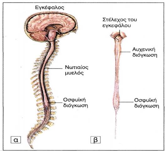 εικ.10α. Κεντρικό νευρικό σύστημα β. Νωτιαίος μυελός.