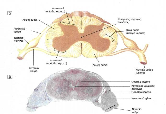εικ.11 Νωτιαίος μυελός σε εγκάρσια τομή α. διάγραμμα β. μικροφωτογραφία