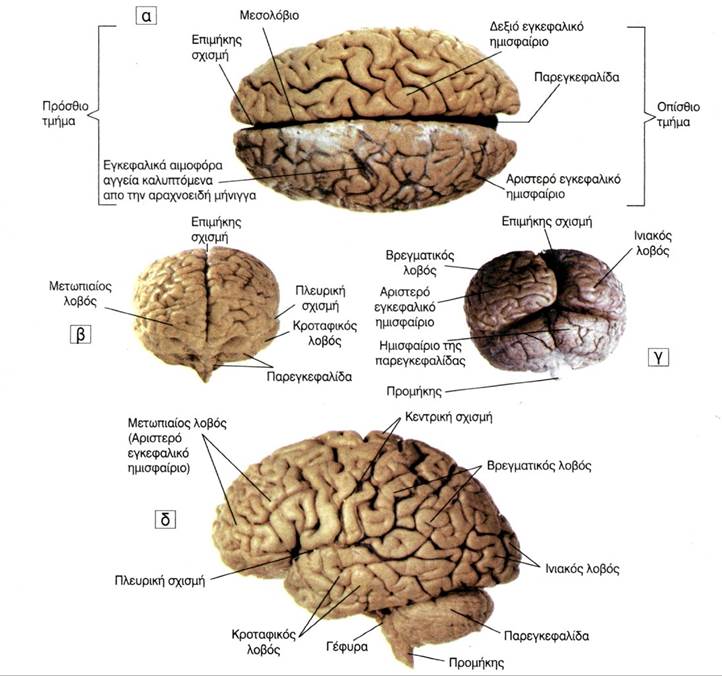 εικ.13 Εγκέφαλος α. Κάτοψη β. Πρόσθια όψη γ. Οπίσθια όψη δ. Πλάγια όψη