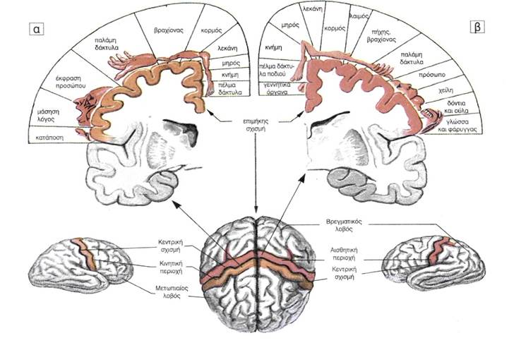 εικ.15α. Περιοχή ελέγχου εκούσιων κινήσεων (μετωπιαίος λοβός) β. Περιοχή γενικών αισθήσεων (βρεγματικός λοβός) Πίνακας 2: Λειτουργίες των λοβών των ημισφαιρίων