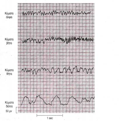 Τα εγκεφαλικά κύματα που καταγράφονται διαφέρουν σε ένταση και συχνότητα ανάλογα με τη δραστηριότητα διάφορων ομάδων νευρώνων. Όταν το άτομο είναι ξυπνητό καταγράφονται συνήθως δύο είδη κυμάτων, τα κύματα α και τα κύματα β. Τα κύματα α, με συχνότητα 6-13/sec και διαφορά δυναμικού περίπου 45 mV κυριαρχούν, όταν το άτομο είναι σε ηρεμία με κλειστά τα μάτια, και εξαφανίζονται κατά τη διάρκεια του ύπνου. Τα κύματα β, με συχνότητα μεγαλύτερη από 13/sec αλλά ένταση μικρότερη από αυτήν των α, καταγράφονται, όταν το άτομο εκτελεί μία πνευματική εργασία. Τα κύματα θ, με συχνότητα 4-7/sec, που εμφανίζονται κυρίως στα παιδιά, μπορεί να καταγραφούν στους ενήλικες στα πρώτα στάδια του ύπνου και σε καταστάσεις συναισθηματικής φόρτισης. Τα κύματα δ, με συχνότητα μικρότερη από 4/sec, καταγράφονται κατά τη διάρκεια του βαθύ ύπνου, κατά την οποία, κάθε 90 min περίπου, καταγράφεται (για 5-20 min) έντονη ηλεκτρική δραστηριότητα. Αυτή οφείλεται στη δραστηριότητα ορισμένων περιοχών του εγκεφάλου (παράδοξος ύπνος). Ο παράδοξος ύπνος συνοδεύεται από όνειρα, ακανόνιστο καρδιακό και αναπνευστικό ρυθμό και από ταχεία κίνηση των βολβών των οφθαλμών. Το ηλεκτροεγκεφαλογράφημα αποτελεί διαγνωστικό μέσο. Μπορεί να χρησιμοποιηθεί για τη διάγνωση μορφών επιληψίας και την ύπαρξη όγκων στον εγκέφαλο. Τέλος, χρησιμοποιείται για τον καθορισμό του εγκεφαλικού θανάτου σε ασθενείς που βρίσκονται σε κώμα, διότι η παύση της λειτουργίας του εγκεφάλου έχει ως συνέπεια την απουσία οποιασδήποτε ηλεκτρικής δραστηριότητας.