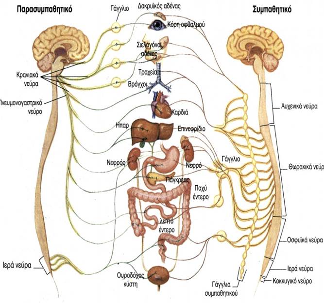 εικ.17 Αυτόνομο Νευρικό Σύστημα Το Αυτόνομο Νευρικό Σύστημα (ΑΝΣ) περιλαμβάνει κέντρα που εντοπίζονται στο ΚΝΣ και κινητικά νεύρα (εικ.17). Λειτουργεί συνεχώς και με ακούσιο τρόπο, και οι λειτουργίες του ρυθμίζονται κυρίως από αντανακλαστικά. Οι νευρικές ώσεις, που προέρχονται από υποδοχείς του δέρματος και των σπλάχνων, καταλήγουν σε κέντρα που βρίσκονται στον εγκέφαλο και στο νωτιαίο μυελό. Οι κινητικές ίνες που ξεκινούν από αυτά τα κέντρα φτάνουν στα γάγγλια του ΑΝΣ και από εκεί στα εκτελεστικά όργανα (αδένες, σπλάχνα). Η επεξεργασία των νευρικών ώσεων στα γάγγλια δίνει στο ΑΝΣ ένα βαθμό αυτονομίας από τον εγκέφαλο και το νωτιαίο μυελό. Το ΑΝΣ χωρίζεται σε δύο κλάδους, στο συμπαθητικό και στο παρασυμπαθητικό. Στην περίπτωση που και οι δύο κλάδοι του ΑΝΣ νευρώνουν το ίδιο όργανο, η δράση τους είναι ανταγωνιστική. Για παράδειγμα, η δράση του συμπαθητικού έχει ως αποτέλεσμα τη διαστολή της κόρης του οφθαλμού, ενώ η δράση του παρασυμπαθητικού έχει ως αποτέλεσμα τη συστολή της. Επίσης το ΑΝΣ ελέγχει την συχνότητα του καρδιακού παλμού, η οποία αυξάνεται με τη δράση του συμπαθητικού και ελαττώνεται με τη δράση του παρασυμπαθητικού. Το συμπαθητικό έχει, γενικά, σημαντικό ρόλο σε καταστάσεις έντασης ή έκτακτης ανάγκης. Το παρασυμπαθητικό, αντίθετα, ελέγχει τις λειτουργίες του οργανισμού, όταν αυτός βρίσκεται σε ηρεμία. Επαναφέρει επίσης τις λειτουργίες σε κανονικό ρυθμό ύστερα από καταστάσεις έντασης. Ο συντονισμός της δράσης των δύο συστημάτων ρυθμίζει με ακρίβεια τις ακούσιες λειτουργίες του μυοκαρδίου, των λείων μυών και των αδένων. Το ΑΝΣ, αν και διατηρεί κάποιο βαθμό ελευθερίας, ελέγχεται από τον εγκέφαλο. Τα κέντρα ελέγχου της καρδιακής και αναπνευστικής λειτουργίας, που βρίσκονται στον προμήκη, δέχονται πληροφορίες από υποδοχείς των σπλάχνων, και, μέσω του ΑΝΣ, δίνουν τις κατάλληλες εντολές στα εκτελεστικά όργανα. Παρόμοια, ο υποθάλαμος, ελέγχοντας το ΑΝΣ, ρυθμίζει τη θερμοκρασία του σώματος, τα αισθήματα της πείνας και της δίψας, το ισοζύγιο του νερού και των αλάτων. Ανώτερα κέντρα στον εγκέφαλο ρυθμίζουν, μέσω του ΑΝΣ, τη συναισθηματική έκφραση και τη συμπεριφορά ατόμων που βρίσκονται σε κατάσταση συναισθηματικής φόρτισης. Περίληψη Το Νευρικό Σύστημα διαιρείται ανατομικά στο ΠΝΣ και το ΚΝΣ. Το ΠΝΣ αποτελείται από 12 ζεύγη εγκεφαλικών και από 31 ζεύγη νωτιαίων νεύρων. Το ΠΝΣ νευρώνει τους σκελετικούς μυς και τα εσωτερικά όργανα. Το ΚΝΣ αποτελείται από το νωτιαίο μυελό και τον εγκέφαλο. Ο νωτιαίος μυελός, ο οποίος βρίσκεται στο σπονδυλικό σωλήνα, περιέχει αντανακλαστικά κέντρα και δέσμες νευραξόνων, που συνδέουν τον εγκέφαλο με τα περιφερικά νεύρα. Τα αντανακλαστικά είναι αυτόματες απαντήσεις του οργανισμού σε διάφορα ερεθίσματα, και κάποια από αυτά δεν απαιτούν την μεσολάβηση του εγκεφάλου. Ο εγκέφαλος, που προστατεύεται από τα οστά της κρανιακής κοιλότητας, από τις μήνιγγες και από το εγκεφαλονωτιαίο υγρό, αποτελεί κέντρο πολλών λειτουργιών. Τα ημισφαίρια είναι το σημαντικότερο τμήμα του εγκεφάλου. Ο φλοιός των ημισφαιρίων, ο οποίος λόγω των ελίκων και των αυλάκων έχει μεγάλη επιφάνεια, είναι το κέντρο των συνειδητών λειτουργιών. Κάθε λειτουργία εντοπίζεται σε συγκεκριμένη περιοχή του φλοιού των ημισφαιρίων και μπορεί να σχετίζεται με την κατανόηση και ερμηνεία διάφορων ερεθισμάτων, με τις εντολές προς τους σκελετικούς μ