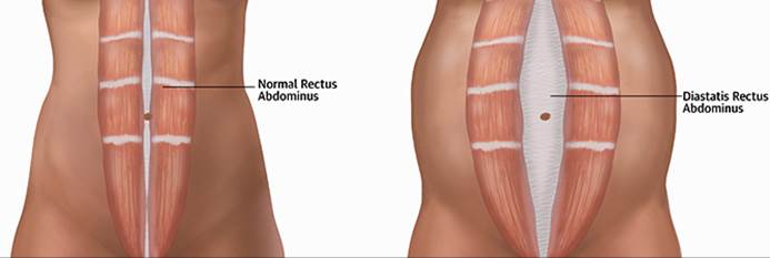 Όταν υπάρχει διάσταση των ορθών κοιλιακών μυών, η κοιλιά προβάλει προς τα έξω και δίνει την εντύπωση εγκυμονούσας κατάστασης. Η διάσταση των ορθών κοιλιακών, δημιουργεί πρωτίστως αισθητικό πρόβλημα. Αυτό συμβαίνει γιατί η μήτρα, το παχύ και το λεπτό έντερο και τα άλλα όργανα που βρίσκονται μέσα στην κοιλιά προβάλλουν προς τα έξω, καθώς δεν υπάρχουν οι ορθοί κοιλιακοί μύες ώστε να τα συγκρατήσουν. Η διάσταση των ορθών κοιλιακών μυών, εκτός από το αισθητικό πρόβλημα, μπορεί να προκαλέσει πόνους στη μέση, δυσκοιλιότητα και διαφυγή ούρων. Ορισμένες φορές δυσκολεύει την αναπνοή ή ακόμη και την κίνηση. Χειρουργική θεραπεία
