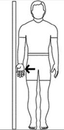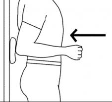 Εικόνα 4 - Έξω στροφή ώμου με τον ώμο σε 90 μοίρες απαγωγή Άσκηση 4 Έσω στροφή ώμου με τον ώμο σε 90 μοίρες απαγωγή (εικόνα 5). Ξεκινάμε στην όρθια στάση όπως δείχνει η εικόνα. Κρατάμε την σπονδυλική μας στήλη ευθεία και αναπνέουμε κανονικά. Σταθεροποιούμε τον ελαστικό ιμάντα πίσω και μακριά από το σώμα μας σε ένα σημείο μακριά από το σώμα μας και χαμηλά όπως δείχνει η εικόνα. Έπειτα κρατάμε τον ιμάντα με τον αγκώνα λυγισμένο στις 90 μοίρες. Τώρα τραβάμε τον ιμάντα φέρνοντας τον καρπό μας μπροστά και κάτω χωρίς να αλλάζουμε την θέση του ώμου μέχρι το τέλος της κίνησης και επιστρέφουμε αργά στην αρχική θέση. Επαναλαμβάνετε 15 φορές.