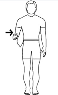 Άσκηση 2 Έξω στροφή ώμου (εικόνα 3). Ξεκινάμε στην όρθια στάση όπως δείχνει η εικόνα. Κρατάμε την σπονδυλική μας στήλη ευθεία και αναπνέουμε κανονικά. Σταθεροποιούμε τον ελαστικό ιμάντα πλάι και μακριά από το σώμα μας σε ένα σημείο στο ύψος του αγκώνα μας. Έπειτα κρατάμε τον ιμάντα με το χέρι μας όπως δείχνει η εικόνα με τον αγκώνα λυγισμένο στις 90 μοίρες. Τοποθετούμε μια τυλιγμένη πετσέτα κάτω από τον ώμο μας την οποία και σφίγγουμε κατά την διάρκεια της άσκησης σαν να μην θέλουμε να πέσει κάτω. Τώρα τραβάμε τον ιμάντα απομακρύνοντας τον καρπό από τον αντίθετο αγκώνα μέχρι το τέλος της κίνησης και επιστρέφουμε αργά στην αρχική θέση. Επαναλαμβάνετε 15 φορές. Εικόνα 3 - Έξω στροφή ώμου **