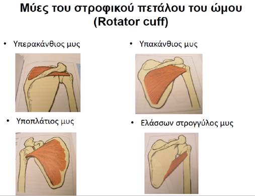 Το στροφικό πέταλο του ώμου αποτελείται από τέσσερις μυς και τους τένοντές τους, που «αγκαλιάζουν» την κεφαλή του βραχιονίου. Οι μυς αυτοί είναι**:** ο υποπλάτιος, ο υπερακάνθιος, ο υπακάνθιος και ο ελάσσων στρογγύλος.