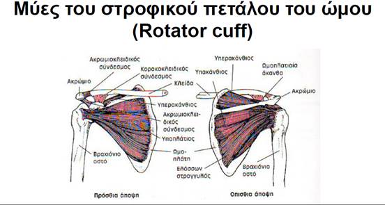 α) η διατήρηση της σταθερότητας της άρθρωσης του ώμου και β) η ανύψωση και οι στροφικές κινήσεις του βραχίονα. Τα κύρια συμπτώματα των ρήξεων του στροφικού πετάλου είναι ο πόνος και ο περιορισμός των κινήσεων στην άρθρωση του ώμου. Ο πόνος μπορεί να εμφανίζεται σε ηρεμία ή κατά τον ύπνο, ιδιαίτερα αν ο ασθενής κοιμάται στο πάσχον πλευρό. Επίσης, μπορεί να εμφανίζεται κατά την ανύψωση και το κατέβασμα ή τις στροφικές κινήσεις του βραχίονα. Ο περιορισμός της κινητικότητας του ώμου οφείλεται είτε στον πόνο είτε στη μυϊκή αδυναμία, που προκύπτει από τη ρήξη των τενόντων. Η συνηθέστερη ρήξη αφορά στον υπερακάνθιο και προκαλεί κυρίως περιορισμό στην ανύψωση του βραχίονα. Η διάγνωση γίνεται με ειδικές δοκιμασίες κατά την κλινική εξέταση και επιβεβαιώνεται με μαγνητική τομογραφία ή υπερηχογράφημα.