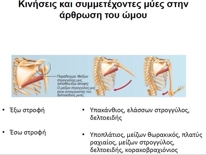 Κάμψη Η άρθρωση του ώμου είναι άρθρωση πολυαξονική, στην οποία παρουσιάζονται οι εξής κινήσεις: Κάμψη - έκταση - υπερέκταση - απαγωγή - προσαγωγή - έσω στροφή - έξω στροφή - οριζόντια απαγωγή - οριζόντια προσαγωγή - διαγώνια απαγωγή και προσαγωγή. Ο τύπος της άρθρωσης είναι σφαιροειδής και το εύρος της κίνησης είναι 0° έως 180°. Οι αρθρικές επιφάνειες είναι η κεφαλή του βραχιονίου και η ωμογλήνη της ωμοπλάτης.