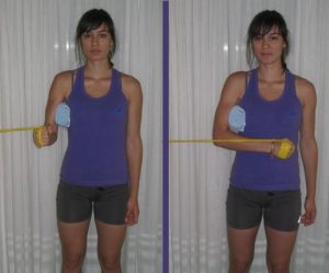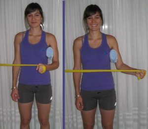 Εικόνα 1 - στροφείς μύες του ώμου Ξεκινώντας το πρόγραμμα ενδυνάμωσης των στροφέων μυών του ώμου εκτελείτε 3 σετ των 15 επαναλήψεων για τις δύο πρώτες από τις παρακάτω ασκήσεις. Έπειτα όσο βελτιώνεται η δύναμή σας, προχωρήστε στην εκτέλεση των ασκήσεων 3 και 4. Επαναλαμβάνετε 2 με 3 φορές την εβδομάδα. Κατά την διάρκεια των ασκήσεων πρέπει να μην αισθάνεστε πόνο ή κάποιο άλλο σύμπτωμα. Άσκηση 1 Έσω στροφή ώμου (εικόνα 2). Ξεκινάμε στην όρθια στάση όπως δείχνει η εικόνα. Κρατάμε την σπονδυλική μας στήλη ευθεία και αναπνέουμε κανονικά. Σταθεροποιούμε τον ελαστικό ιμάντα πλάι και μακριά από το σώμα μας σε ένα σημείο στο ύψος του αγκώνα μας. Έπειτα κρατάμε τον ιμάντα με το χέρι μας όπως δείχνει η εικόνα με τον αγκώνα λυγισμένο στις 90 μοίρες. Τοποθετούμε μια τυλιγμένη πετσέτα κάτω από τον ώμο μας την οποία και σφίγγουμε κατά την διάρκεια της άσκησης σαν να μην θέλουμε να πέσει κάτω. Τώρα τραβάμε τον ιμάντα πλησιάζοντας τον καρπό προς τον αντίθετο αγκώνα μέχρι το τέλος της κίνησης και επιστρέφουμε αργά στην αρχική θέση. Επαναλαμβάνετε 15 φορές. Εικόνα 2 - Έσω στροφή ώμου