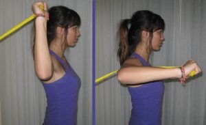 ** Άσκηση 3 Έξω στροφή ώμου με τον ώμο σε 90 μοίρες απαγωγή (εικόνα 4). Ξεκινάμε στην όρθια στάση όπως δείχνει η εικόνα. Κρατάμε την σπονδυλική μας στήλη ευθεία και αναπνέουμε κανονικά. Σταθεροποιούμε τον ελαστικό ιμάντα μπροστά και μακριά από το σώμα μας σε ένα σημείο μακριά από το σώμα μας και χαμηλά όπως δείχνει η εικόνα. Έπειτα κρατάμε τον ιμάντα με τον αγκώνα λυγισμένο στις 90 μοίρες. Τώρα τραβάμε τον ιμάντα φέρνοντας τον καρπό μας πάνω και πίσω χωρίς να αλλάζουμε την θέση του ώμου μέχρι το τέλος της κίνησης και επιστρέφουμε αργά στην αρχική θέση. Επαναλαμβάνετε 15 φορές.